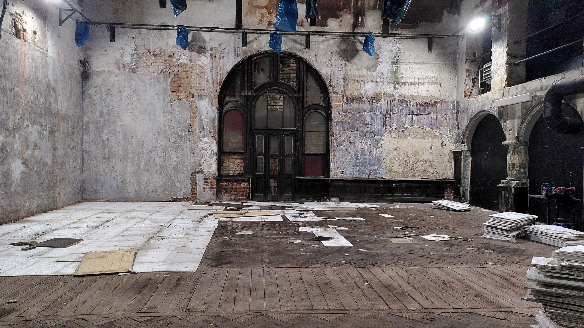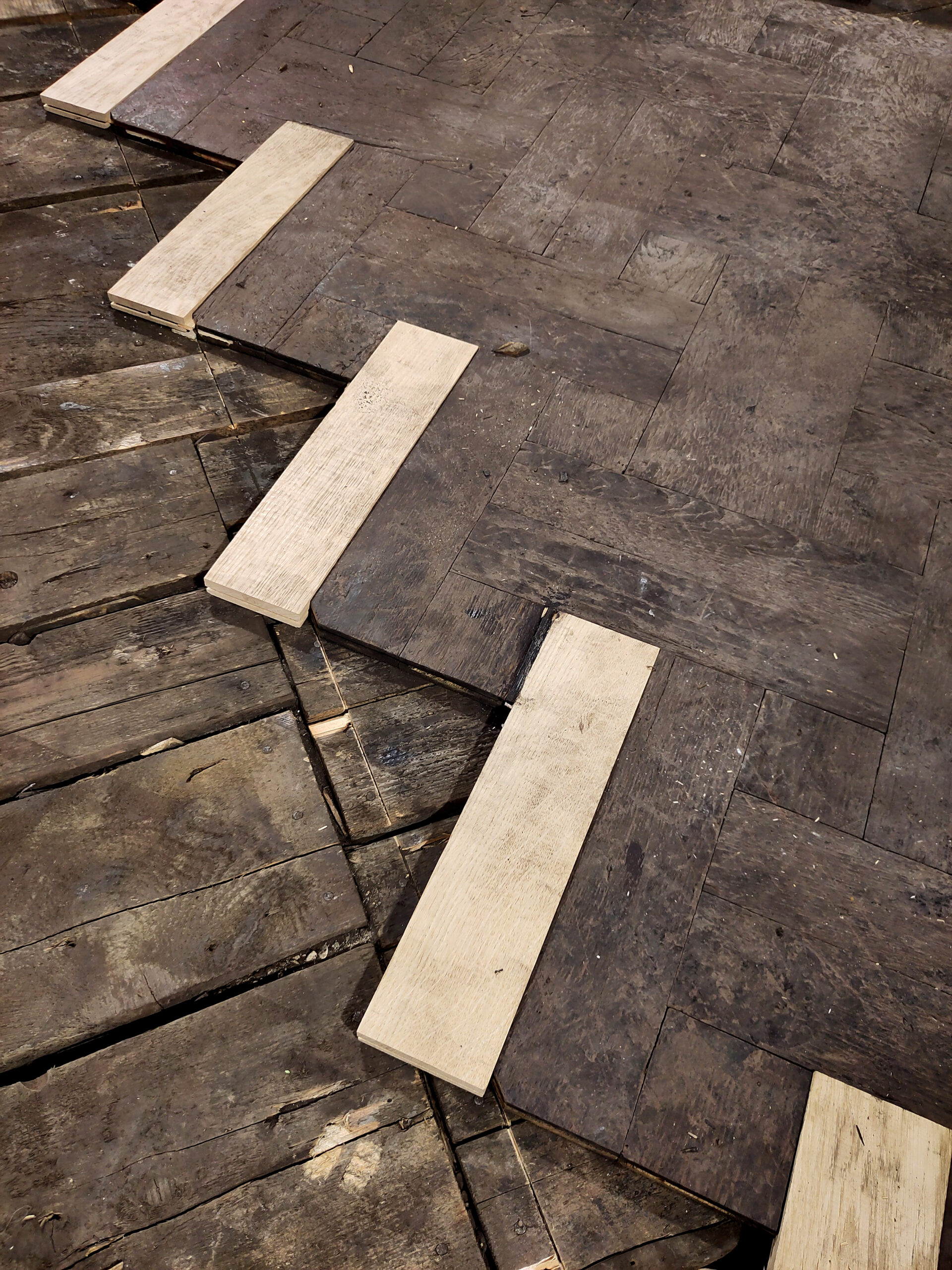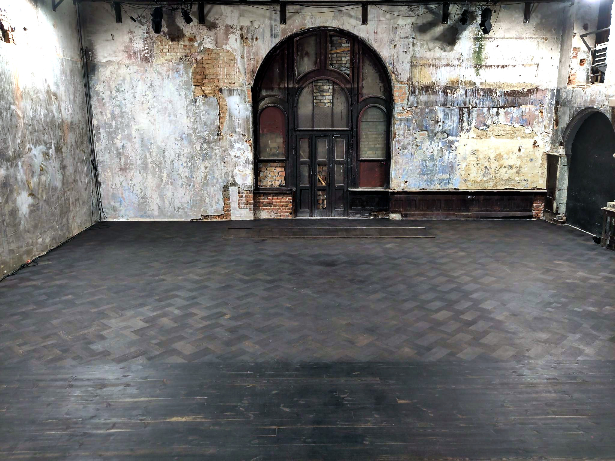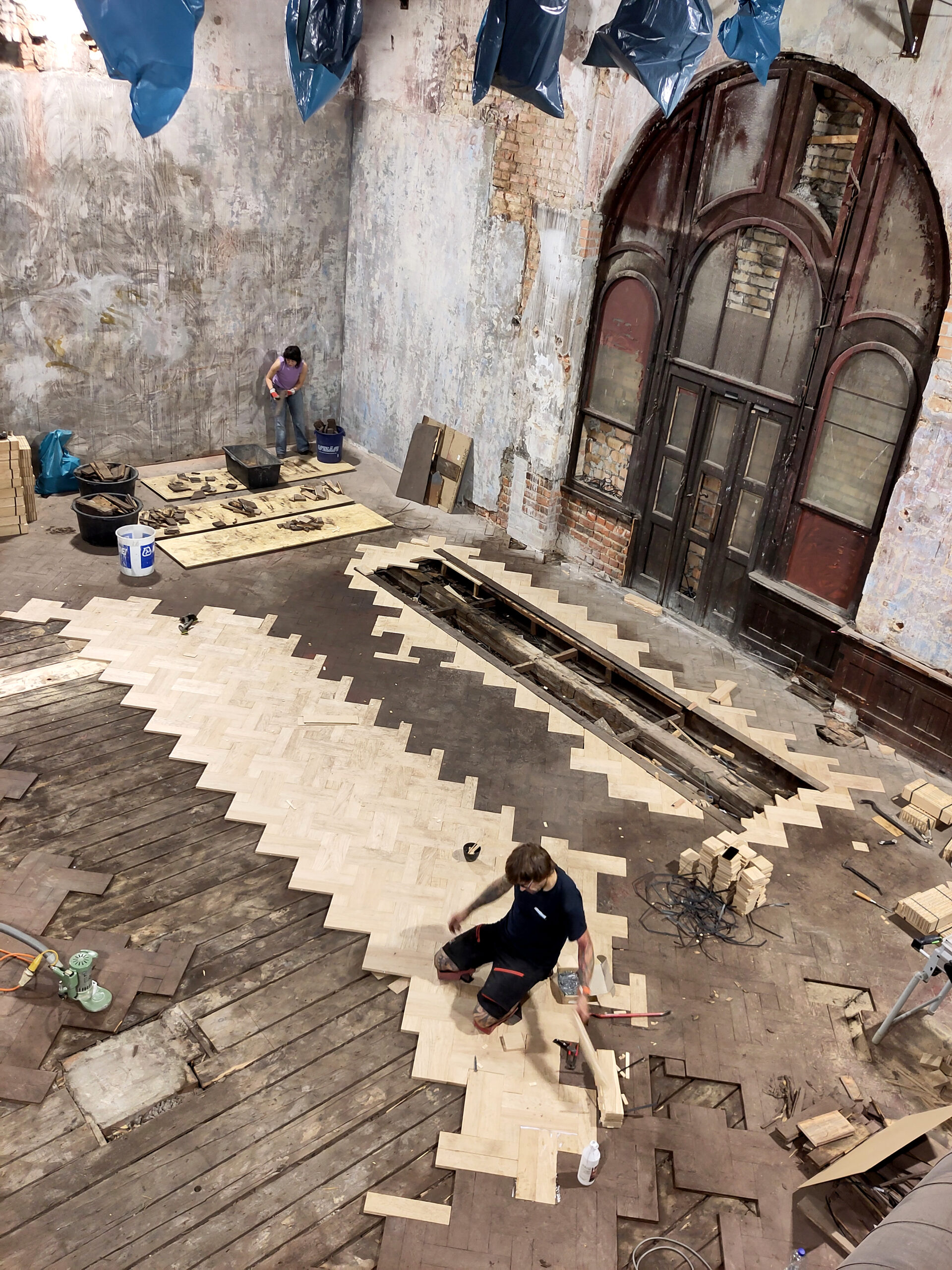 Der Bühnenboden im alten Ballsaal war nicht mehr sicher und statt einen neuen verlegen zu lassen, haben wir uns dazu entschieden, das Original-Parkett von 1900 freizulegen und zu restaurieren.