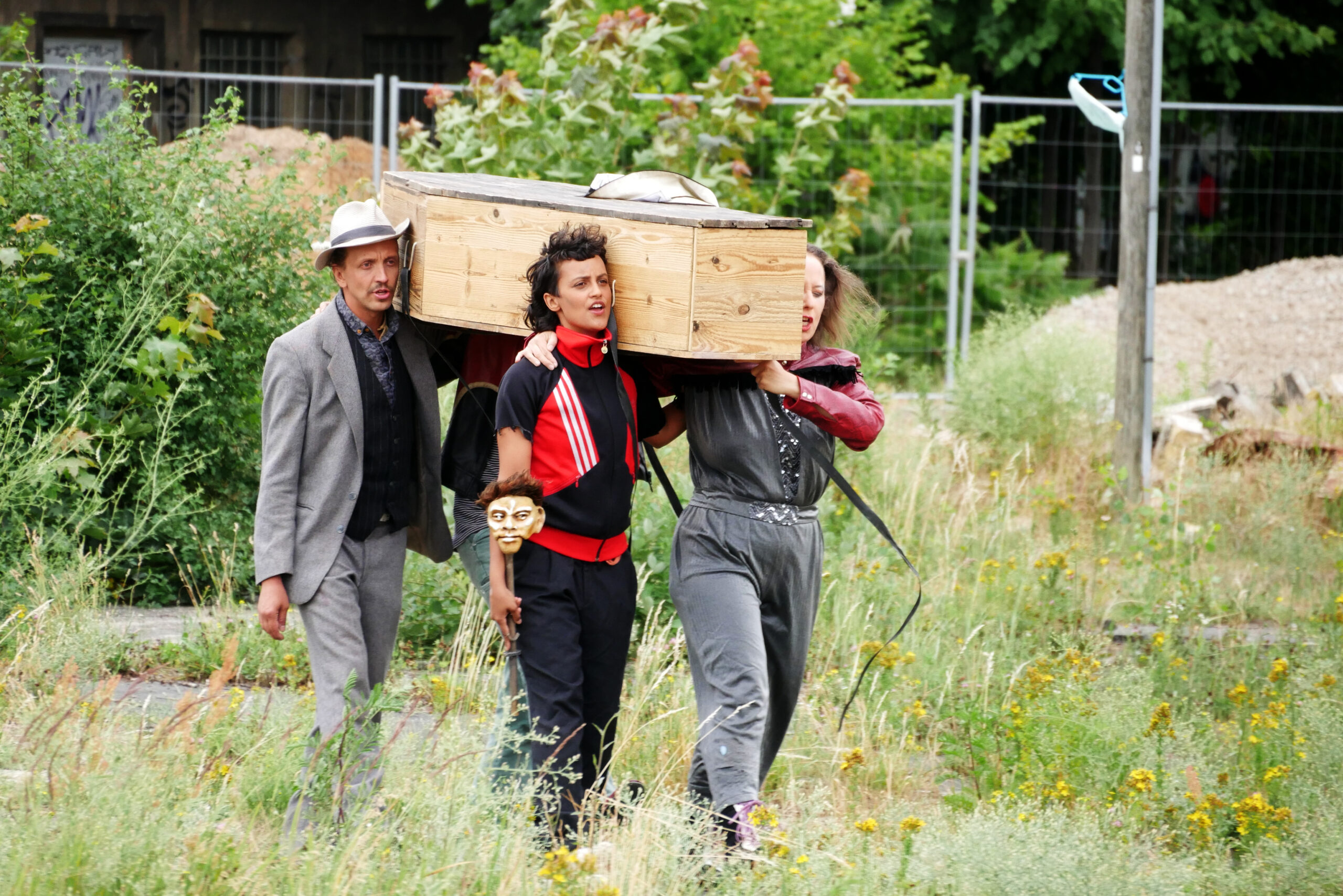 Und so biegen die Figurentheaterduos Lehmann und Wenzel und die flunker produktionen mit quietschenden Rädern um die Ecke und laden ab, was es zum Erzählen dieser Geschichte eben braucht: Megafon, Puppen, ein paar Instrumente, Trillerpfeife, eine ganze Menge Fische, einen toten Hund, was zum Schießen, was zum Werfen, viele Aprikosen, einen Sarg, eine Hexe (die eigentlich keine ist), ein bisschen rotes Haar und die große Lust, eine Bande zu bilden!