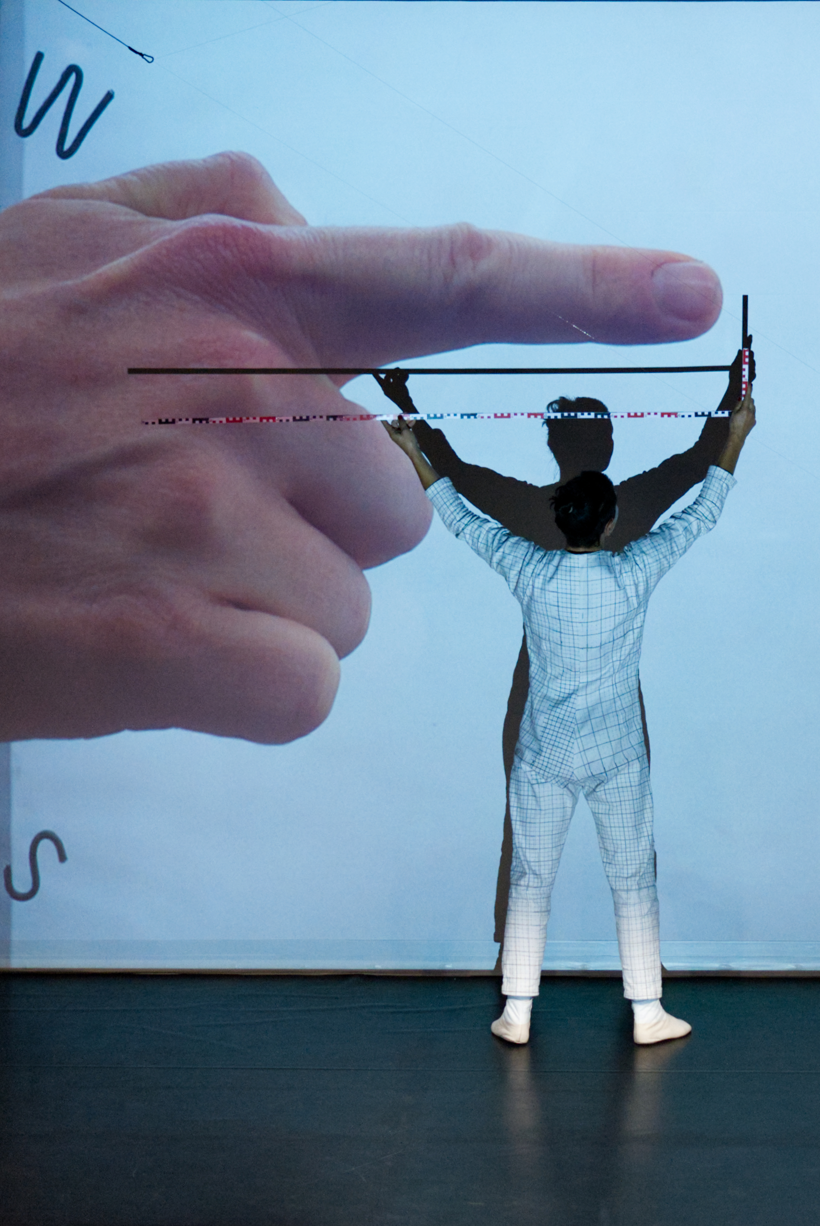 „Feldmessung“ ist eine Performance, die das Messen auf spielerische Weise hinterfragt. Feldmessungen sind zeitlich begrenzt und benutzen spezifische Messtechniken. Was wollen wir und was können wir überhaupt messen (Orte, Zeit, Körper, Gefühle)? Wie und mit welchen Werkzeugen wird gearbeitet? In dem Stück werden physische Gesetze und räumliche Grenzen durch akrobatische Bewegungen, Lichtexperimente und die musikalische Umnutzung von Werkzeugen untersucht.