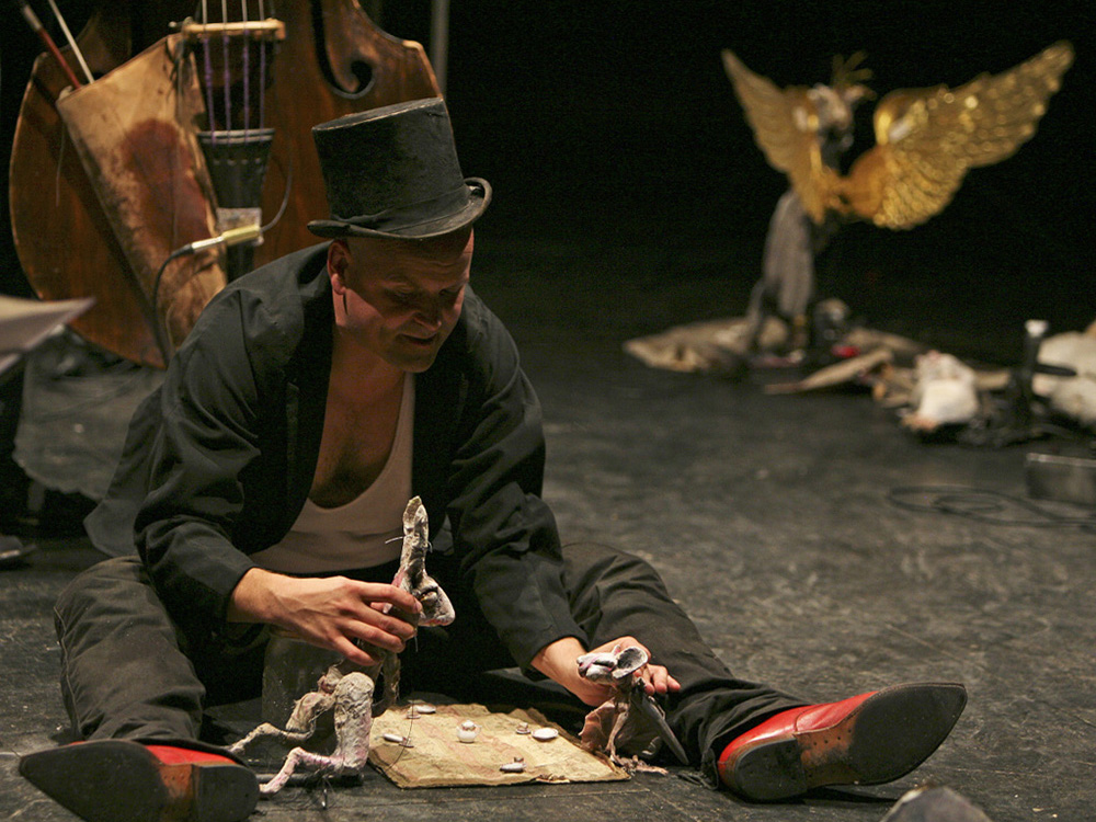 In scenes and songs, „Songs for Alice“ is devoted primarily to the poems of the two volumes. Puppeteers and musicians take the audience into a somnambulant world between fantasy and sudden realization. In director Hendrik Mannes‘ staging, fervent hits and noisy explosions, expressive figures and poetic machines, quiet moments and big ballyhoo, catchy tunes and last dances all find their place.